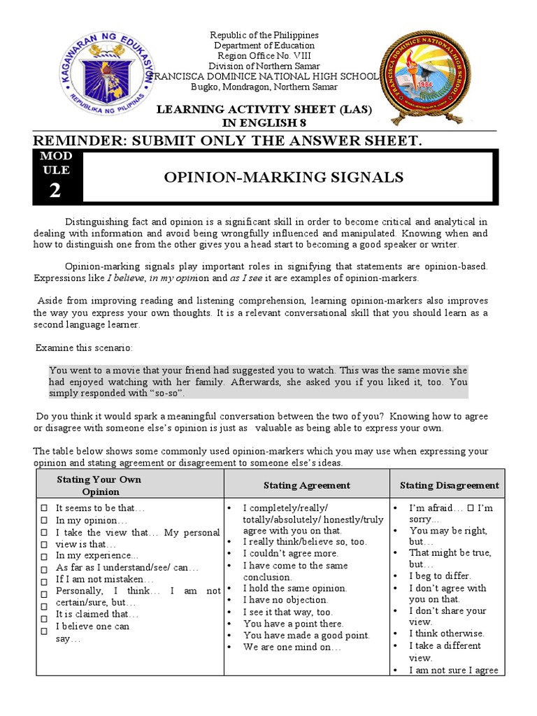 Opinion Marking Signals Examples : Examples Of Opinion Marking Signals Brainly Ph : Expression definition, the act of expressing or setting forth in words:. The free expression of political opinions. Maybe you would like to learn more about one of these? Opinion marking signals other contents: Opinion marking signals other contents: Worksheets are opinion words and phrases, using signal words and phrases lesson plan, chemistry work answer key, fact or opinion quiz, a parents guide to grade 2 curriculum 2, grade 3 writing rubrics, comprehension skills, 25 phrases for expressing opinions.
